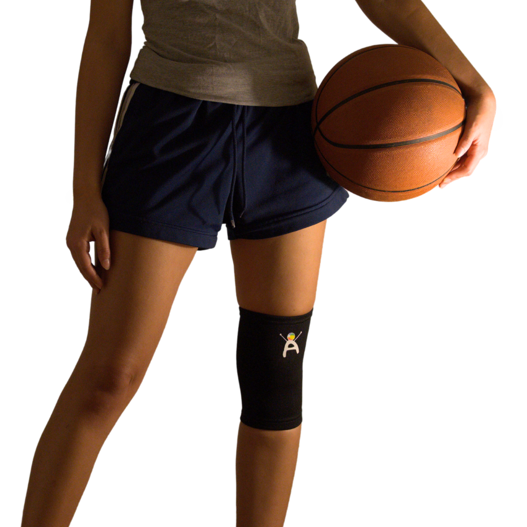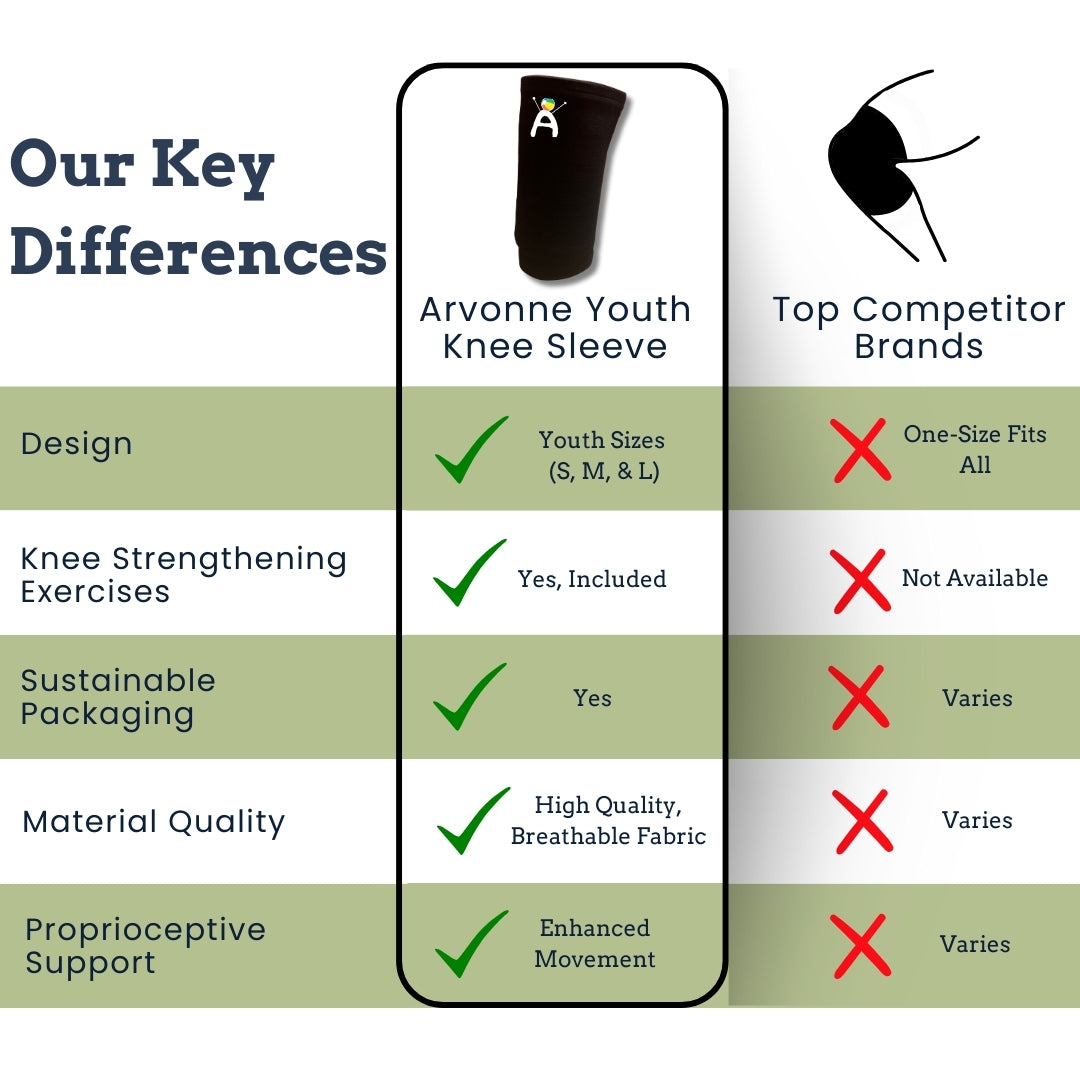 The Black Arvonne Youth Compression Knee Sleeve is sports gear worn around the knee. It provides an extra snug fit that aims to provide support to children's knees during physical activities.